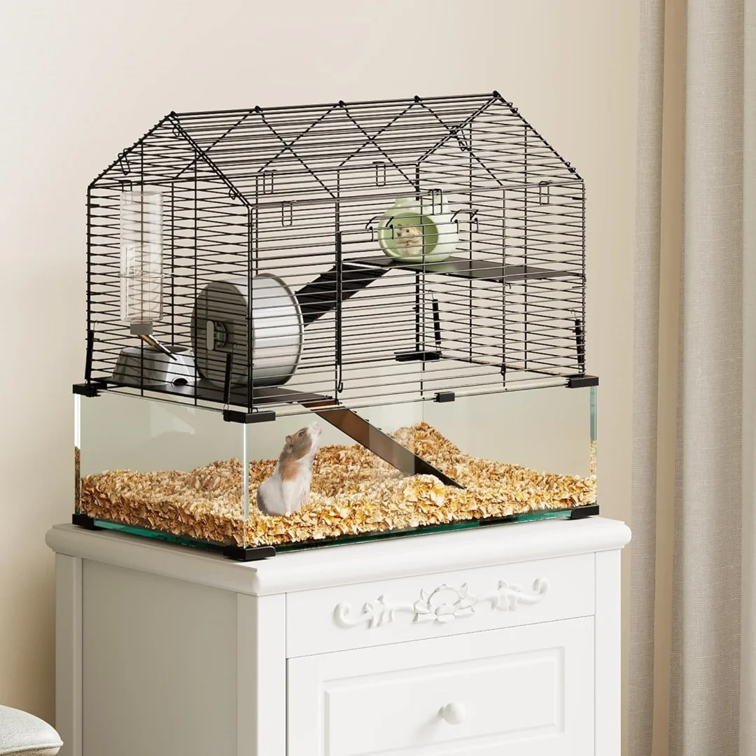 3 Tiers Large Hamster Enclosure, Metal Enclosure + Glass Gerbil Cages, Small Animal Cages for Guinea Pigs Chinchilla Rodent