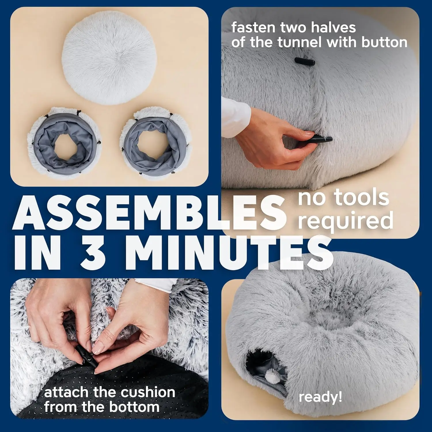 XL Plush Cat Donut Tunnel Bed with Toys - 3-in-1 Foldable Playground & Cozy Cave for Indoor Cats, Ferrets, Rabbits